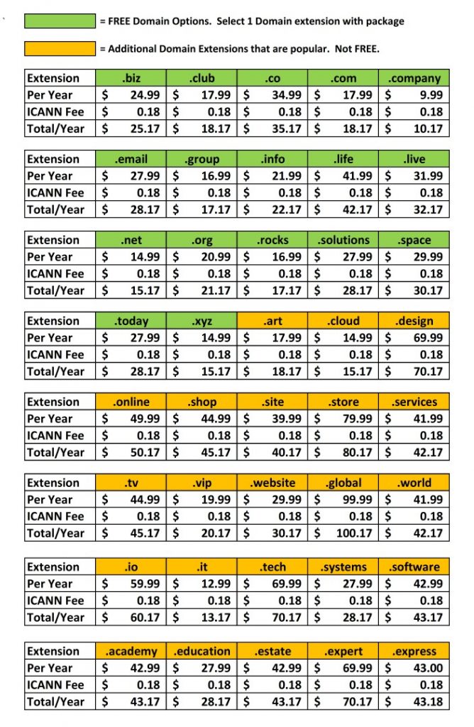 The Feniva Cyber Works website packages includes selecting 1 available domain with one of the following domain suffixes or extensions highlighted in green. Upon request, Client has the option to purchase additional domain names, if available, for an additional charge.