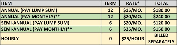 All Feniva Cyber Works Clients pay an initial Website Design fee plus a Managed Web Hosting fee based on their chosen service package. In addition, Feniva Cyber Works Clients pay for any additional services desired, such as additional domain names for their website and/or other services offered under the Feniva umbrella of services.